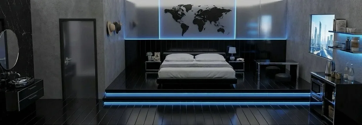 科技主題艙雙人房以俐落線條與燈光設計打造現代科技氛圍,營造簡潔且具有質感的住宿空間。房內配置舒適雙人床與基本設備,兼顧設計感與實用性。 房型附設陽台,讓整體空間更加通透放鬆,同時設有臥榻空間,可依需求彈性加設床墊使用。臥榻貼近地面設計,安全穩定,對於攜帶孩童的旅客更加安心。 是一間兼具現代風格與居住舒適度的雙人房型。